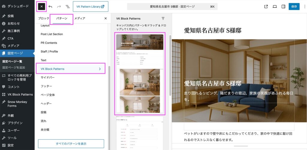カスタム投稿タイプの「施工事例」と「イベント」から新規投稿をした時に、「施工事例」の場合は施工事例用のテンプレート、「イベント」の場合は「イベント用テンプレート」が候補に表示されます。このテンプレートは「VK Block Patterns」で独自のブロックパターンを登録して、パターン追加方式を「候補に表示」にして表示させています。※パターン追加方式を「自動挿入」で自動に挿入することもできます。