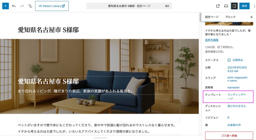 お客様の声のページのテンプレートは、「ランディングページ」になっていますので、新規で作成する場合はここを変更してください。