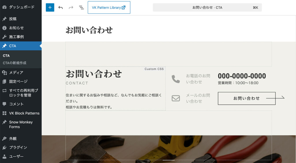 さらに、ページ内で数回しか使わないような個別のデザイン調整は、「VK Blocks Pro」の「カスタムCSS」機能を使ってブロック単位で柔軟に対応しています。