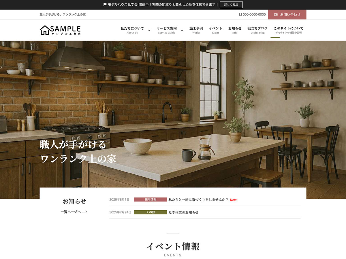 このデモサイトでは、工務店サイトに欠かせない「イベント情報」を効率よく発信・管理できるよう、「イベント」のカスタム投稿タイプを設けて対応しています。